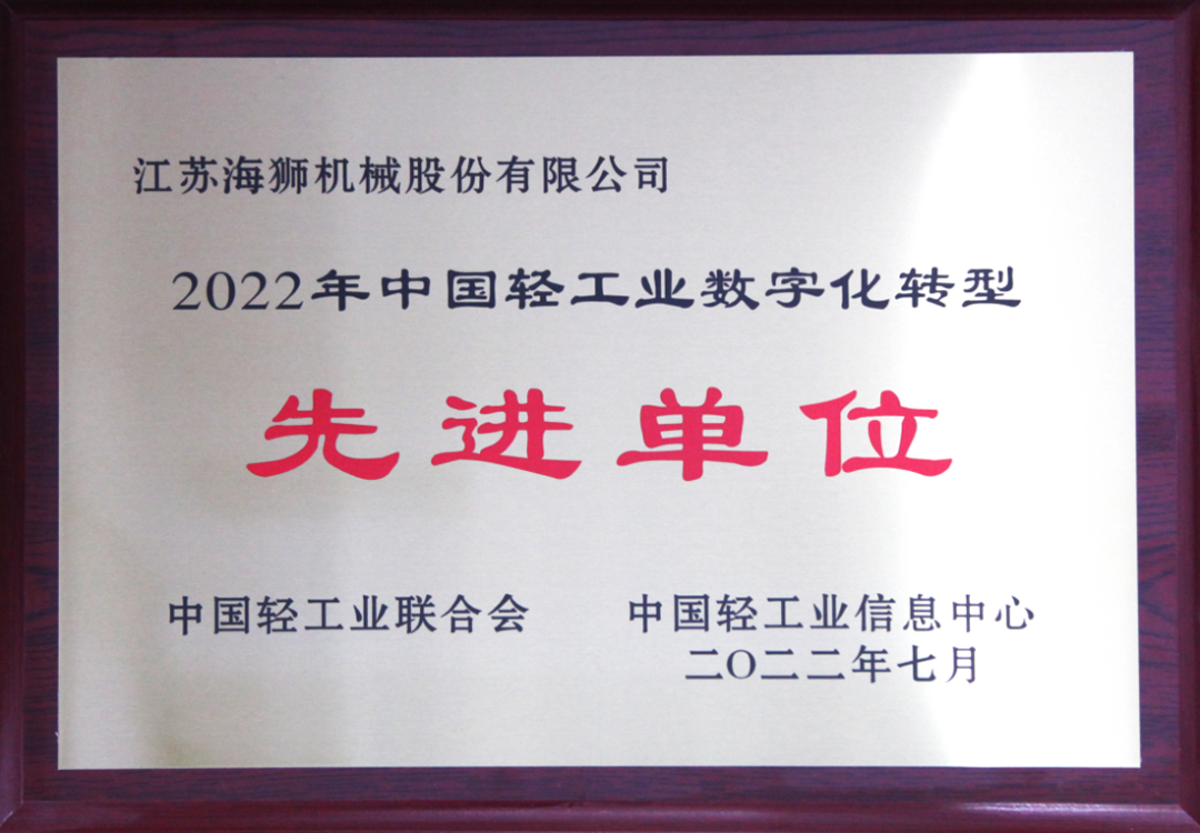 會上,江蘇海獅機(jī)械股份有限公司榮獲“2022年中國輕工業(yè)數(shù)字化轉(zhuǎn)型先進(jìn)單位”表彰。江蘇海獅機(jī)械陳宏董事長榮獲"2022年中國輕工業(yè)數(shù)字化轉(zhuǎn)型領(lǐng)軍人物?!?/p>